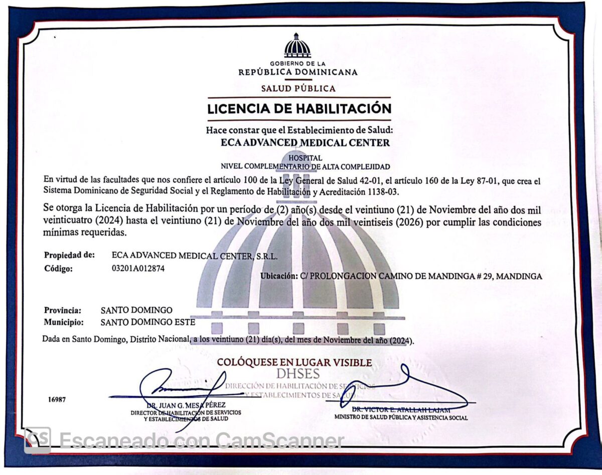ECA Advanced Medical Center opera con todas las habilitaciones y licencias otorgadas por el Ministerio de Salud Pública de República Dominicana, garantizando el cumplimiento de las normativas locales para cirugía cosmética, terapia de células madre y odontología. Esto asegura la seguridad y calidad de los procedimientos, alineándose con los estándares exigidos para el turismo médico.
